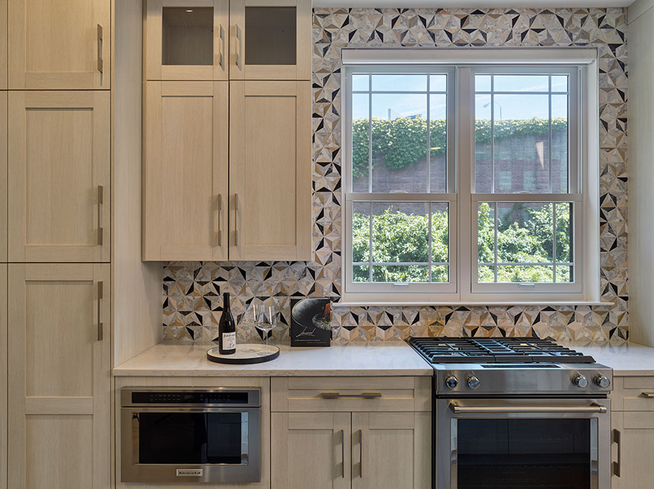 The final decision was to include a quartz by Wilsonart, which the team and client found to be as realistic if not more so than other marble-look quartz options. This marble look is echoed in the prism-shaped, multi-color marble backsplash tile, which helps blend all the warmer tones with the cooler hues in the space.