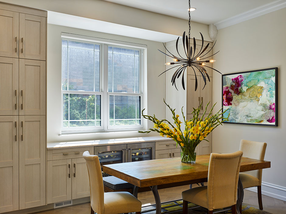 To create more functional storage and prepping areas, she reduced the size of the existing island, moved the range and exhaust hood to the exterior wall and removed the columns. She increased the storage space by planning cabinetry for the entire outside wall, with the exception of the areas directly next to the two main windows. Using a combination of AutoCAD, SketchUp and Enscape to design the layout, Delia ensured that the cabinets offer the right interior storage for specific items that the client uses – such as her wine collection, dishwasher, cookware, linens, cleaning supplies and paperwork. She also shaped the new island as a trapezoid.